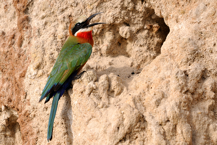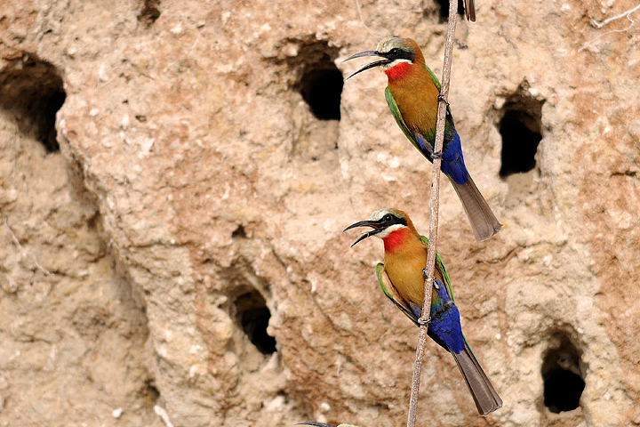 White Fronted Bee Eaters by nest hole, Selous